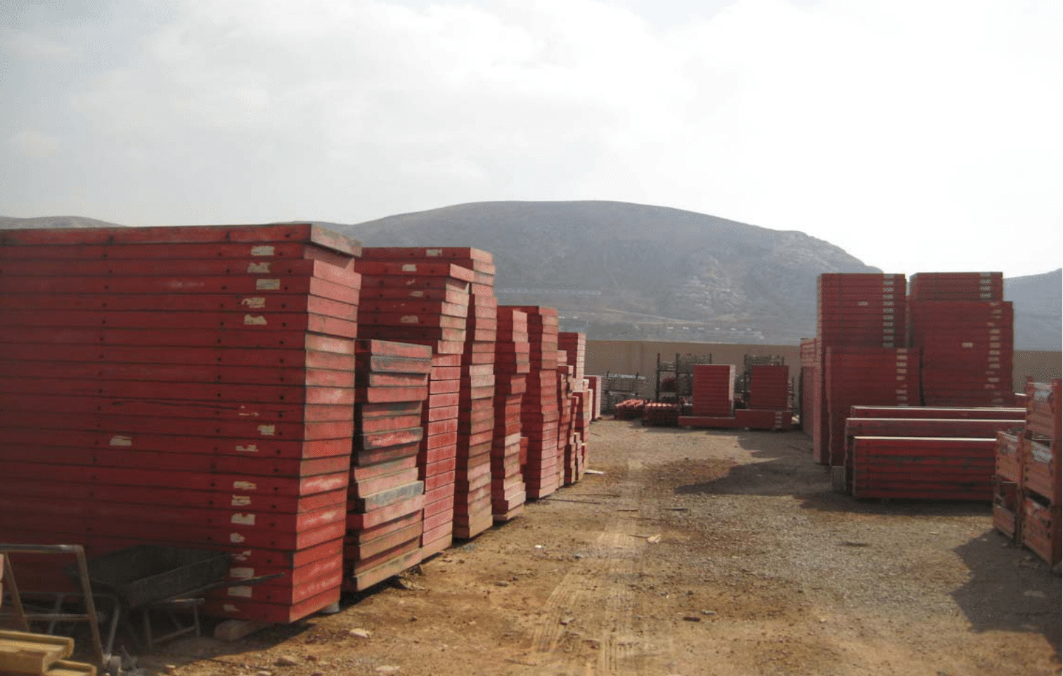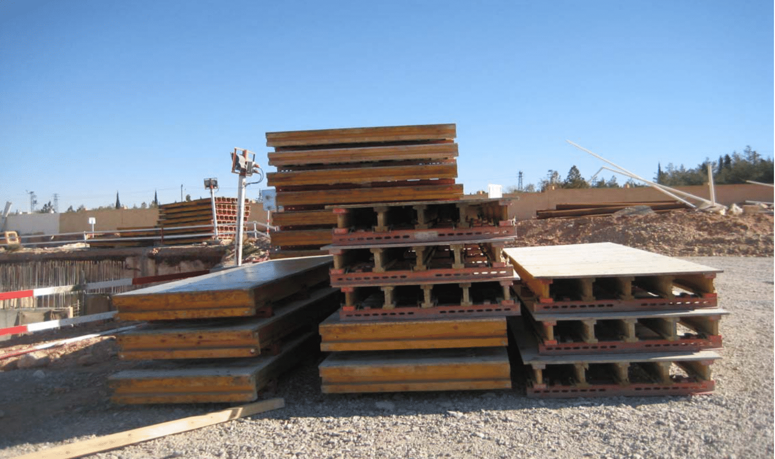 تُظهر هذه الصورة ألواح قوالب المعدنية أو الخشبية المكدسة، وهي جزء أساسي من أنظمة القوالب المستخدمة في صب الخرسانة. تضمن هذه الأنظمة الدقة والمتانة في تشكيل العناصر الخرسانية المختلفة، مثل الأسقف والجدران والأعمدة. نحن نوفر حلول قوالب متكاملة وعالية الجودة لتلبية متطلبات مشاريعكم الإنشائية الكبيرة والصغيرة، مع التركيز على الكفاءة والسلامة في الموقع.