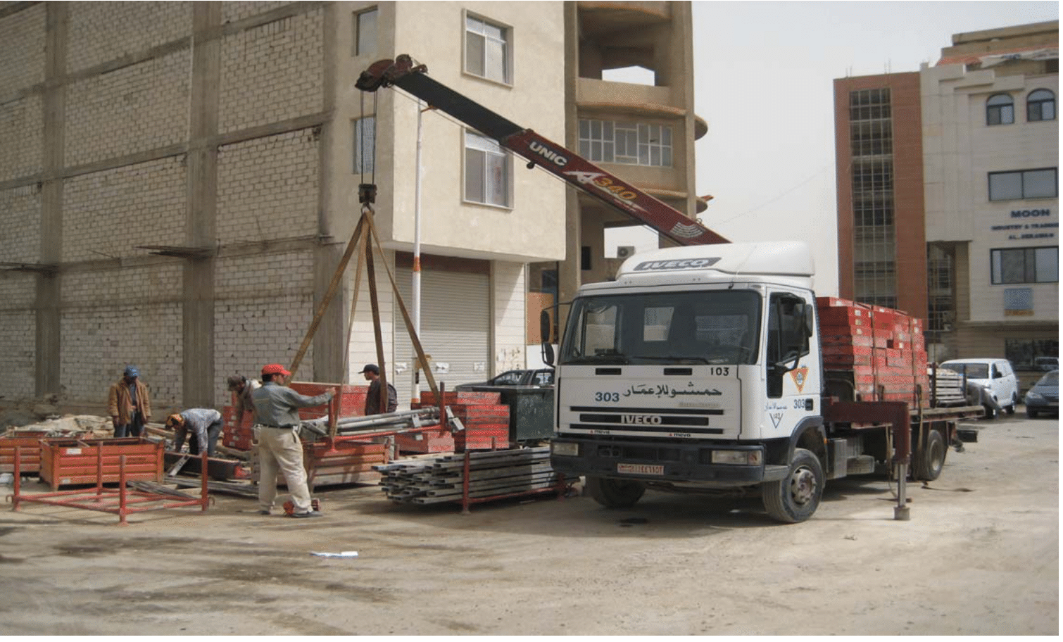 تُظهر هذه الصورة شاحنة مجهزة برافعة (كرين) تقوم بعملية رفع وتنزيل لمواد البناء في موقع إنشاءات. تُعد هذه المعدات ضرورية لضمان سرعة وكفاءة نقل المواد الثقيلة، مثل ألواح قوالب المعدنية، مما يساهم في سير العمل بسلاسة وأمان في مشاريعكم الإنشائية. فريقنا المتخصص يضمن التعامل الآمن والفعال مع جميع المعدات والمواد في الموقع.