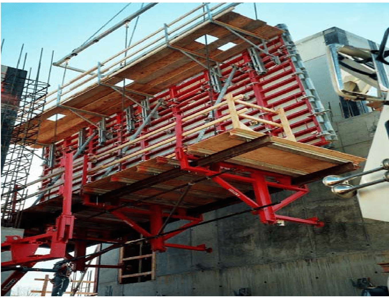 تُظهر هذه الصورة نظام قوالب متسلق قيد الاستخدام في موقع بناء، وهو حل هندسي متطور يُستخدم لصب الجدران الخرسانية في المباني الشاهقة. تتيح هذه الأنظمة التقدم السريع في أعمال البناء مع توفير منصات عمل آمنة للعمال على ارتفاعات مختلفة. نحن متخصصون في توفير وتركيب أنظمة قوالب المتطورة التي تضمن الكفاءة، الدقة، والسلامة في تنفيذ المشاريع الإنشائية الكبرى، مما يساهم في تحقيق أعلى مستويات الجودة في البناء الخرساني.