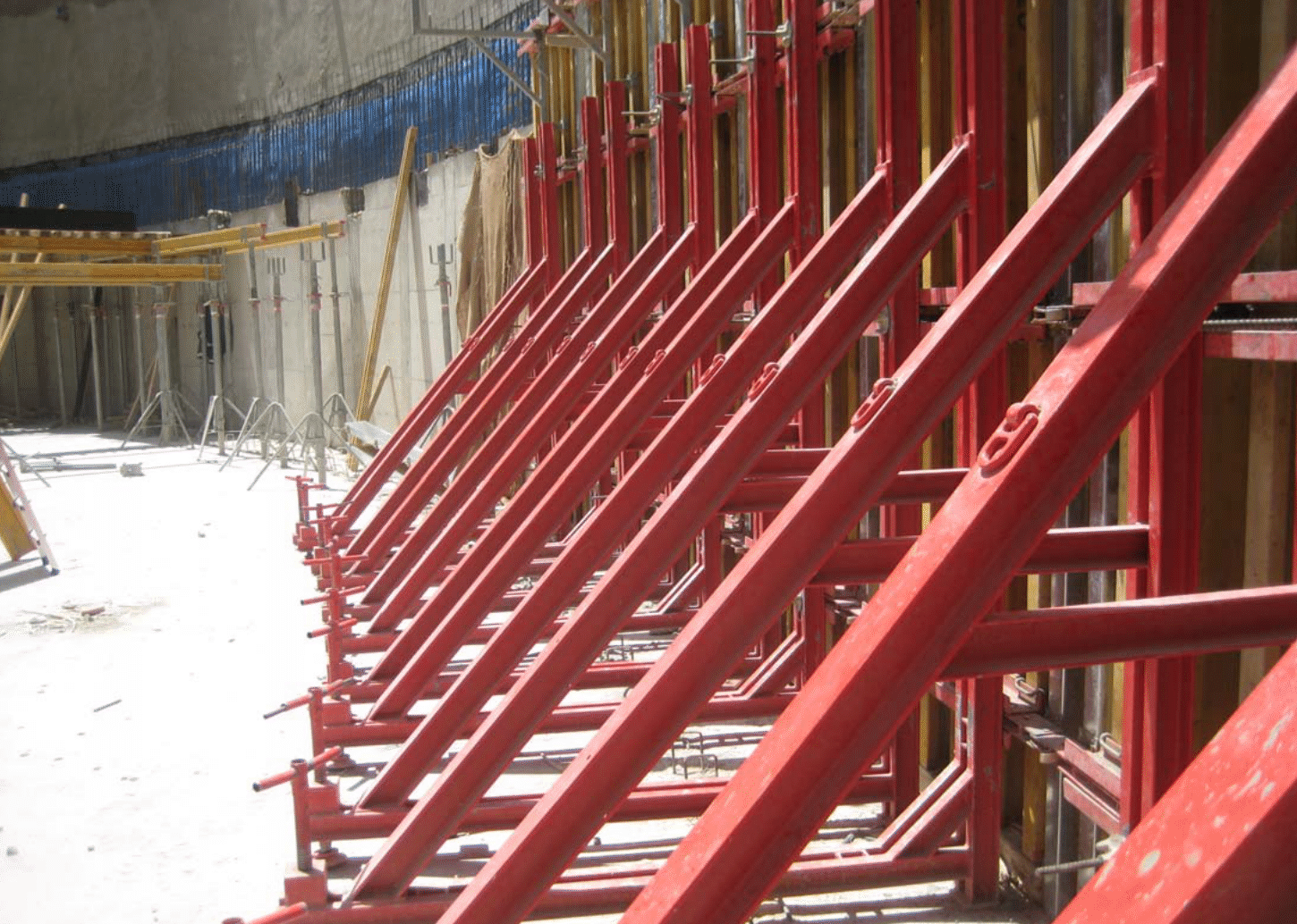 تُظهر هذه الصورة عن قرب نظام قوالب أفقية (دعامات) تُستخدم لدعم الجدران الخرسانية أثناء عملية الصب والتصلب. تُعد هذه الدعامات الحمراء القوية جزءًا حيويًا من نظام القوالب ، حيث توفر الاستقرار اللازم للجدران وتمنع أي تشوهات أثناء صب الخرسانة. نحن نستخدم أحدث أنظمة الدعم والقوالب لضمان بناء هياكل خرسانية قوية، مستقرة، وذات جودة عالية، مع الالتزام بمعايير السلامة الصارمة في جميع مراحل العمل.