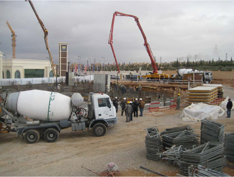 - الوظيفة: هذه أيضاً "مضخة خرسانة محمولة على شاحنة" (Truck-mounted Concrete Pump). تؤدي نفس وظيفة المضخة الأولى، وهي ضخ الخرسانة لمسافات رأسية وأفقية طويلة. وجود مضختين في الموقع يشير إلى حجم العمل الكبير والحاجة إلى صب الخرسانة في مناطق متعددة بشكل متزامن أو متتابع لضمان استمرارية العمل.